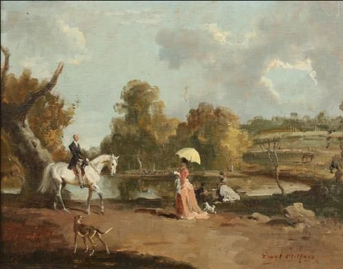 Figures beside a lake, with elegant lady conversing with a gentleman on a grey horse