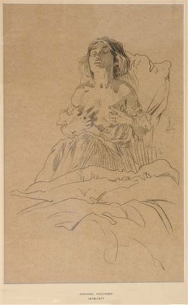 Study of a seated lady semi clad, clutching her breasts