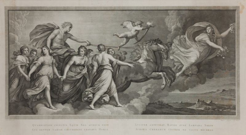 Aurora schwebend vor der Quadriga des Apollo und streut Rosen.
