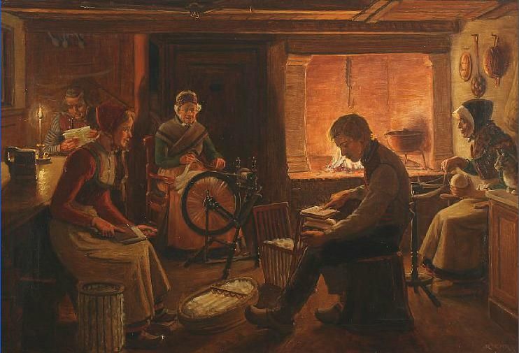 Spinning at eventide in a peasant home.
