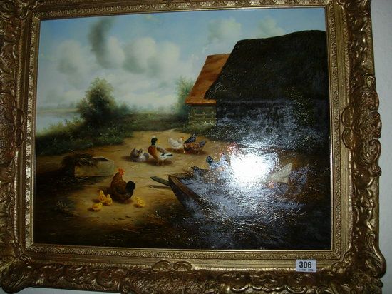 A farmyard scene with hens and ducks and another of ducks and hens at the pond