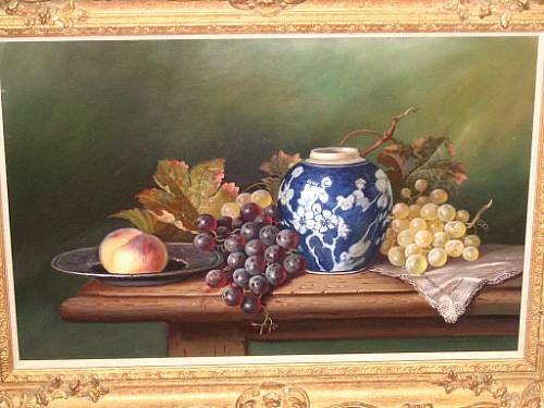 A still life study of a Chinese ginger jar, grapes and a peach on a wooden shelf
