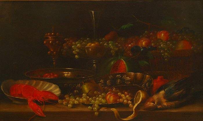 Reiches Stilleben mit Früchten, Hummer und Fasan.