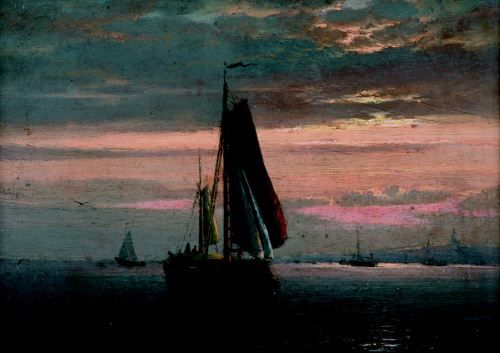 Vissersboten op kalme zee bij avond