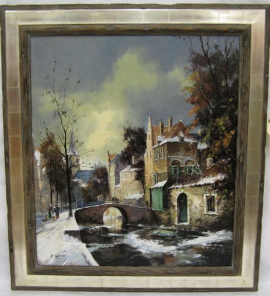 | Dutch city in winter with canal, building dated 1607, figures on stone foot bridge | |