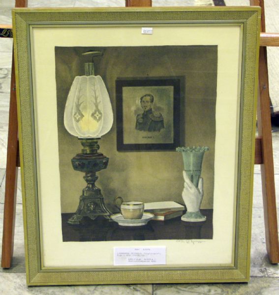 Stilleben med fotogenlampa, kaffekopp och vas.
