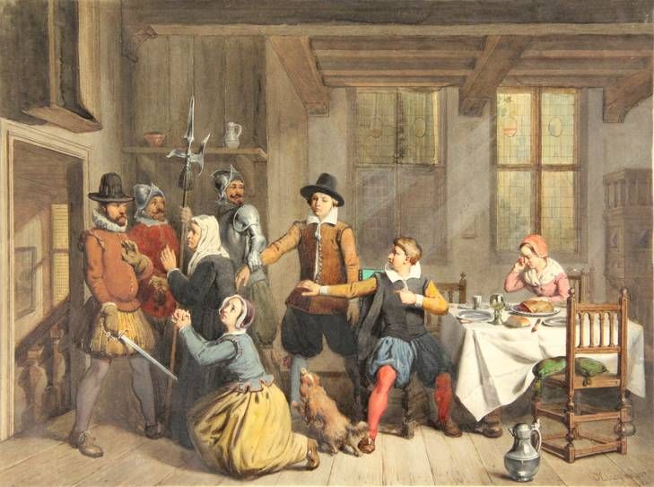 | A young man arrested at the dinner table by a man in armour, a man with a drawn sword and a halbardier, his family supplicating | |