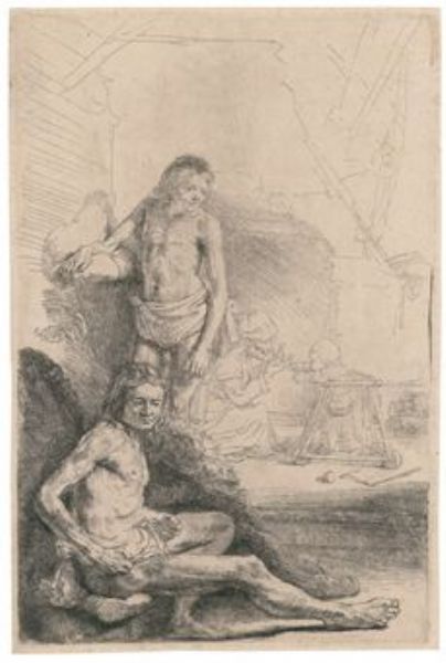 | A nude Man seated and another standing, with a Woman and Baby lightly etched in the Background | |