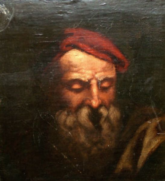 Portrait of an elderly bearded man, head and shoulders, wearing a red beret