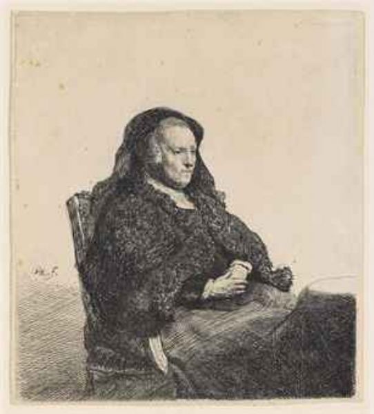 | The Artist's Mother seated at a Table, looking right: Three quarter length (B., Holl. 343; H. 52) | |