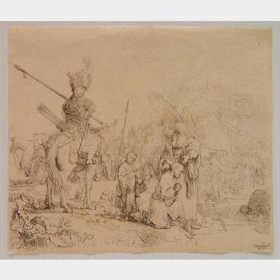 Rembrandt van Rijn (Dutch 106-1669)- ''Baptism of the Eunuch'' (New Hollstein 186iii)- etching, 1641, on tissue thin paper, before Basan rework. 7 3/16 x 8 3/8'' | |
