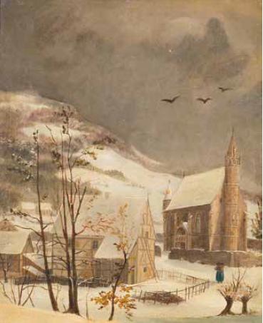 | Verschneite Dorflandschaft mit Blick auf eine Kirche | |