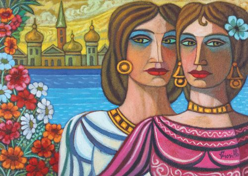 Figure con fiori e paesaggio