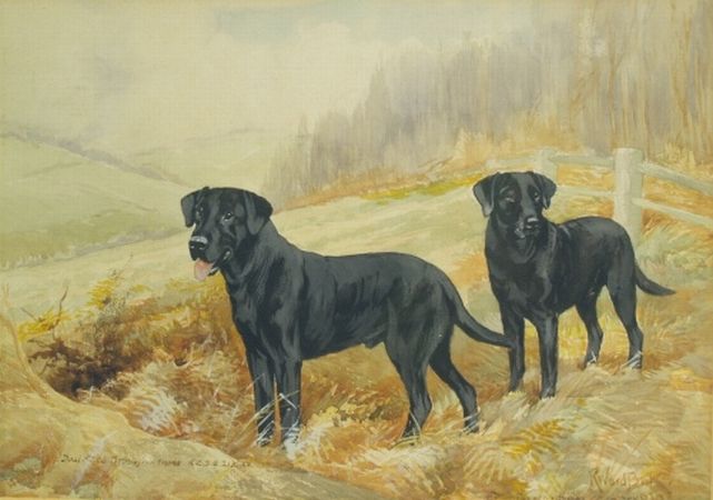 | Ch. Titus of Whitmore and Ch. Tag of Whitmore in a Field (Black Labrador Retrievers) | |