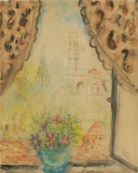 Flowers on a windowsill overlooking Jerusalem 1940's