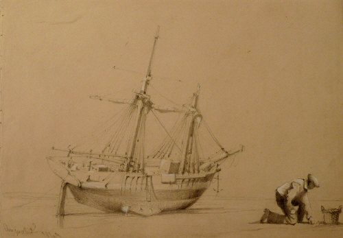 A MAN COLLECTING SHELLFISH ON THE SHORE, WITH A FRIGATE BEYOND