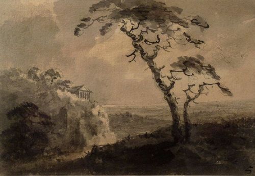 AN ITALIAN LANDSCAPE WITH A TEMPLE ON A HILL
