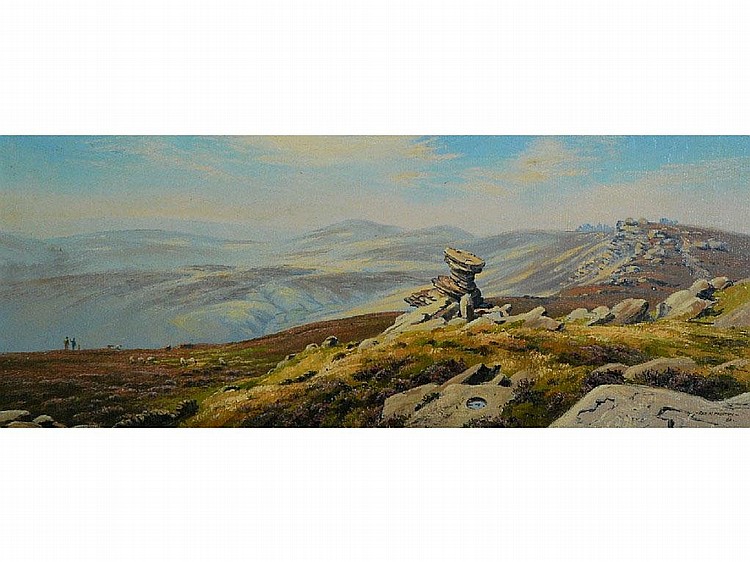 | Extensive moorland landscape with two figures walking by a rocky edge | |