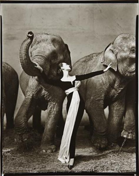 | Dovima with elephants, evening dress by Dior, Cirque d'Hiver, Paris | |