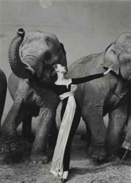 | Dovima with elephants, Evening dress by Dior, Cirque d'Hiver, Paris, August | |