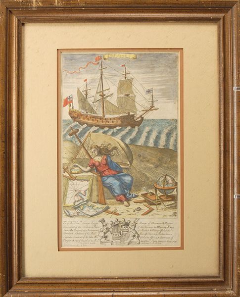| Depicting a classically dressed woman reclining on the beach surrounded by a variety of navigational instruments while a gunship | |