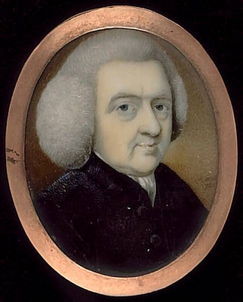 Doctor Lyons, wearing black coat, white cravat and powdered bag wig.
