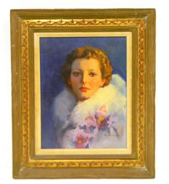 | portrait of 1930s starlet wearing white ermine collar and purple orchid corsage | |