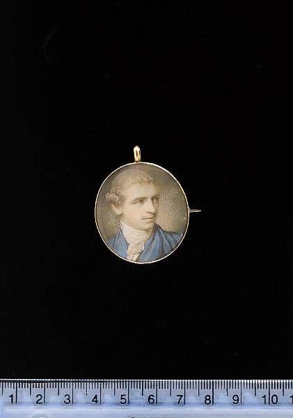 A Gentleman, wearing blue cloak, frilled white chemise and white stock, his hair powdered