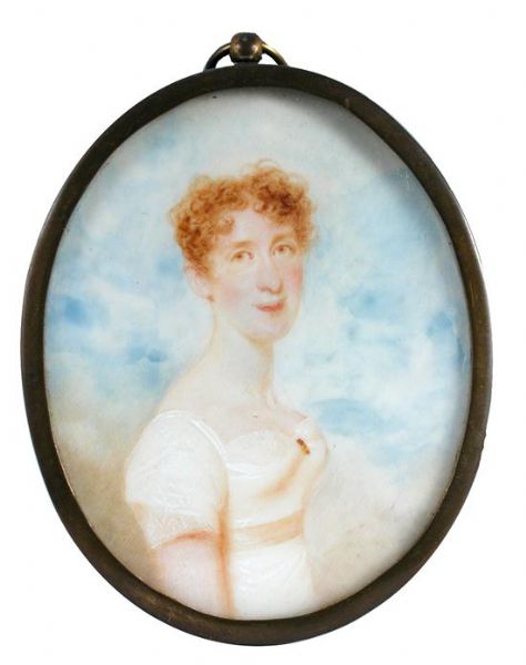 A portrait miniature of a Lady in white dress with frilled collar and blue ribbon waistband