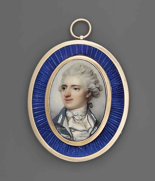 | A young gentleman, in blue coat with white buttons loops, white waistcoat and frilled cravat, powdered hair en queue | |