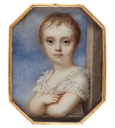 | Watercolor and bodycolour on ivory, gold frame, glazed reverse with hair lock | |