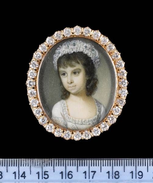| A girl, wearing low-cut white dress with lace trim, a lace bonnet adorned with pink roses in her hair | |