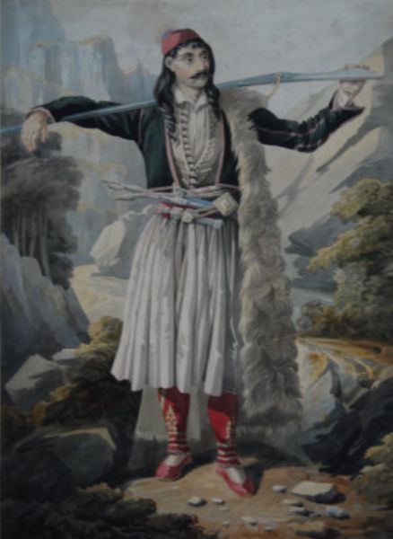Study of a Greek soldier standing with a rifle across his shoulders, in a mountain landscape