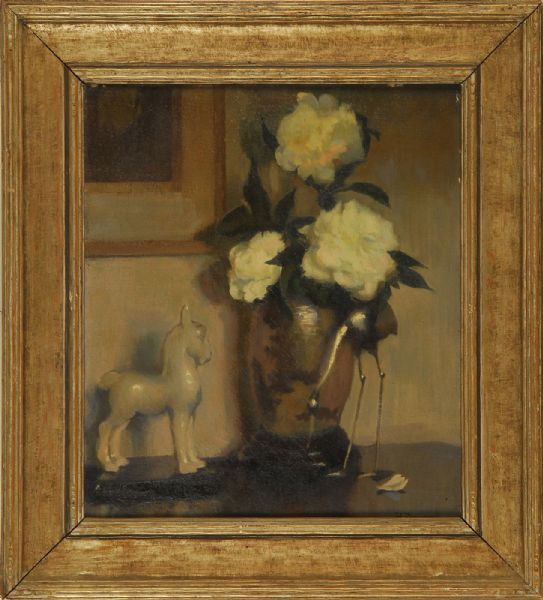Still life with porcelain horse, crane and flowers