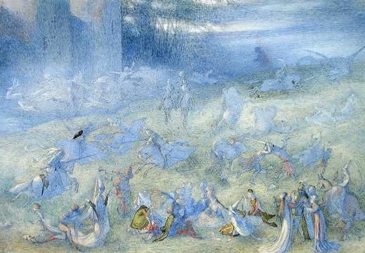 Knights Jousting by Moonlight whilst Maidens on Horseback Look On
