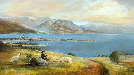 | Blick vom Hoyerberg auf die Inselstadt Lindau mit Bodensee und Gebirgspanorama an einem Frühlingstag. | |