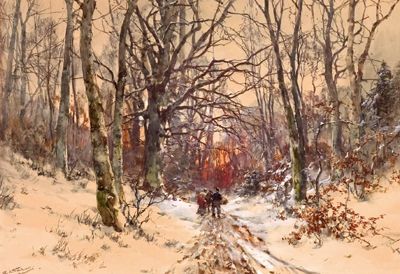 Sonnenuntergang in verschneitem Winterwald mit Reisigsammler