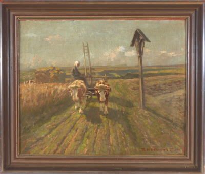 Bäuerin auf einem leeren Ochsenfuhrwerk bei einem Wegkreuz am Kornfeld