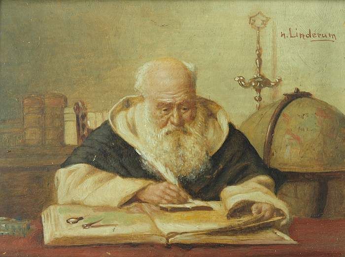 Der Geograph, sitzender Mönch mit langem weißen Bart, als Geograph