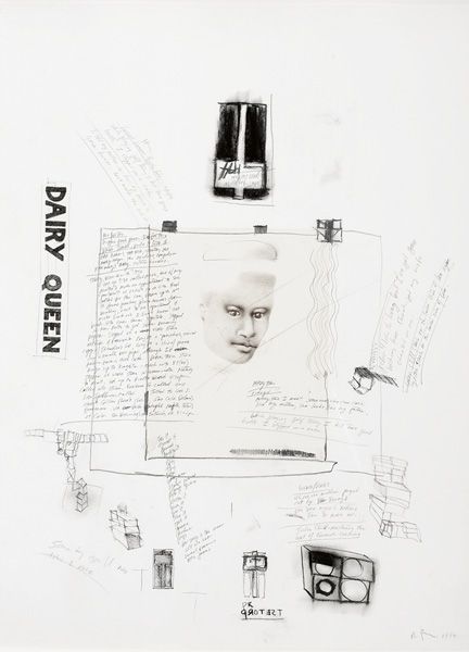 | Graphite ball point pen, charcoal and paper collage on paper. | |