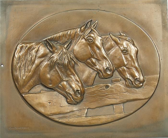 Drei Pferdeköpfe über Gatter schauend