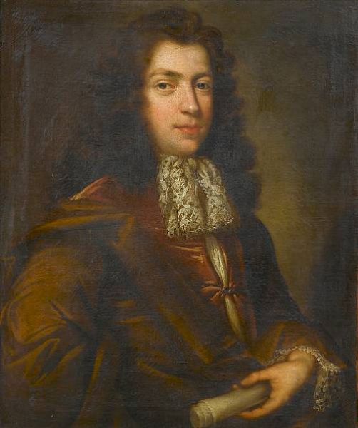 | Portrait of a gentleman, half-length, in a claret coat with a brown wrap and a lace jabot, holding a scroll | |