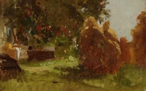 Heumandl und blühender Rosenstrauch hinter einem Bauernhaus