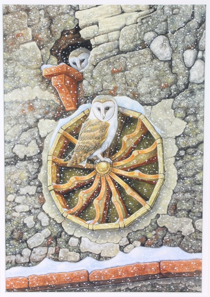 | study of barn owls in a nest and seated on a wheel within a flint wall | |