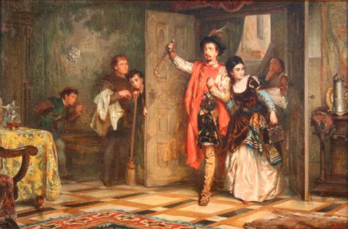 | Interior Scene with Lady and Cavalier entering through a Doorway, near Servants hiding behind the Door | |