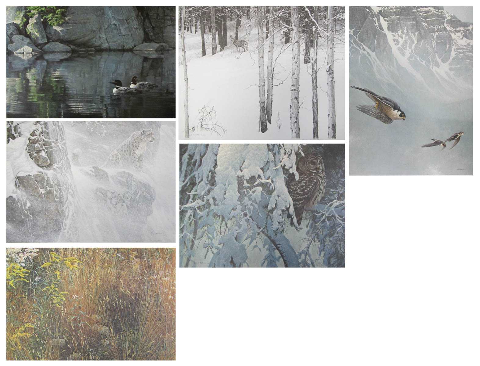"Snowy Hemlock-Barred Owl," "Marginal Meadow, "Peregrine Falcon and White-Throated Swifts," "High-Kingdom Snow Leopard," and "Northern Reflections - Loon Family." Each pencil signed and numbered. Images measure from 19" x 24" to 20.25" x 30.25". Unfr | |