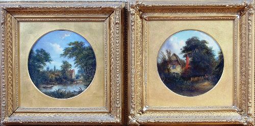 | Matched pair, fisherman on the riverbank with lone boatman, cattle watering, cottages and church beyond, and figure at the garde | |