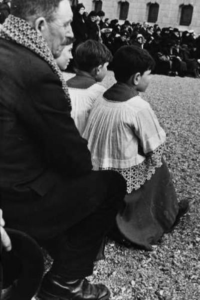 | SITZENDE MENGE BEI DER ANDACHT, VON HINTEN GESEHEN, MIT CHORKNABEN IN DER ERSTEN REIHE | |