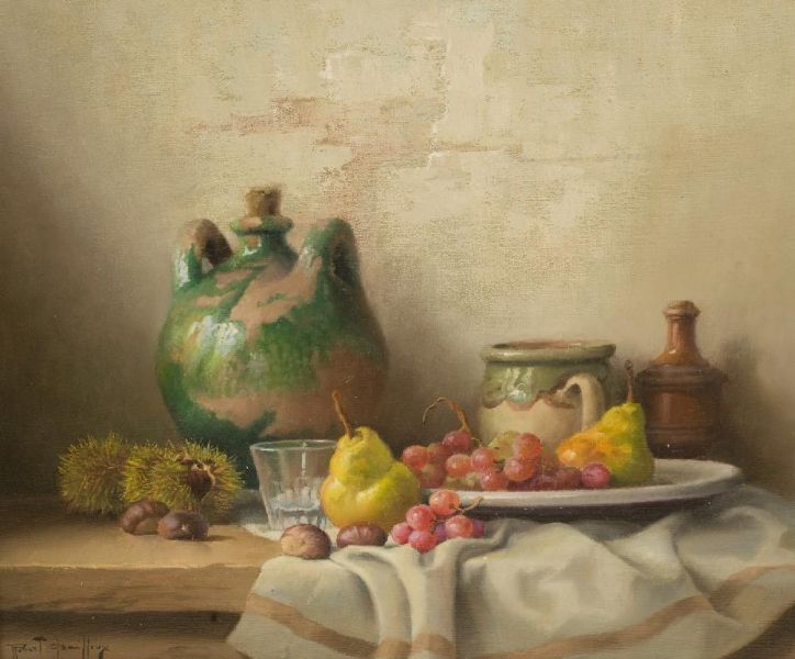 | STILL LIFE OF GRAPES, PEARS AND CHESTNUTS WITH A PLATE AND A JUG ON A LEDGE | |