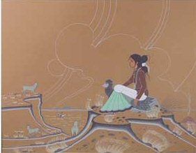 | an enamored young Navajo girl on a small mesa watching a rider below | |